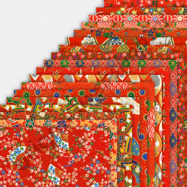 Een unieke set van 18 verschillende bijzondere rode Japanse vellen washi met traditionele Japanse motieven, achterzijdes wit. De vellen zijn 36,1 x 25,7 cm groot met in totaal 18 vel. Het papier voelt zacht aan met een lichte vezelstructuur en is van zeer goede kwaliteit met prachtige intense tinten en veelal met glinsterend goud afgewerkt, made in Japan.